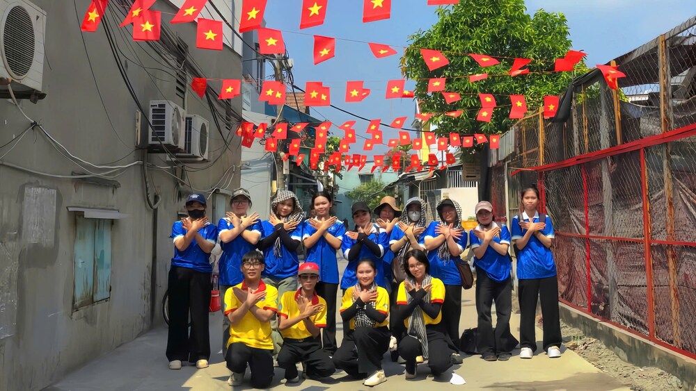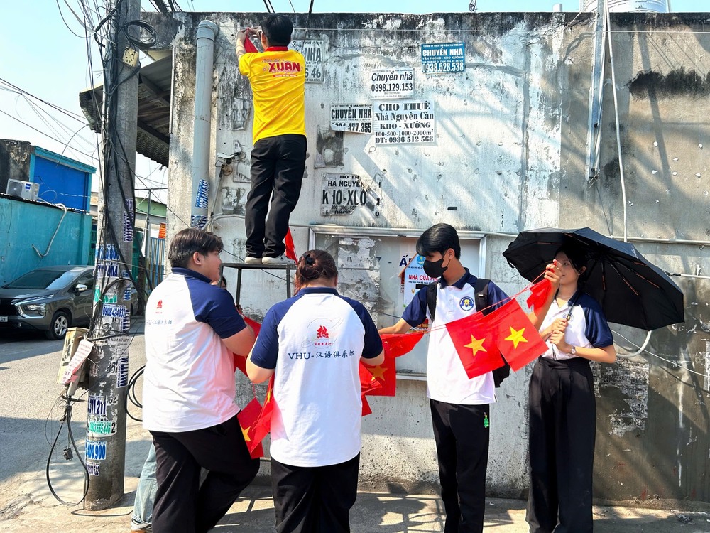 Responding to the Spring Volunteer Campaign, the Youth Union members and students of the Faculty of Medicine and Pharmacy, in collaboration with the Medical Health Club and the Chinese Language Club, implemented the theme of Monday Volunteer Campaign: “Red Flag with Yellow Star,” with activities including hanging national flags, decorating alleys, and spreading the image of spring associated with the spirit of solidarity and community responsibility.