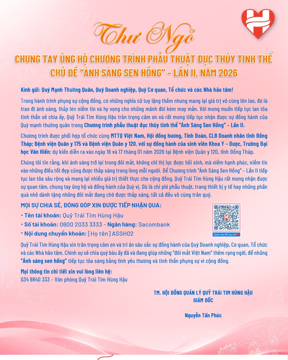 📞 For more information, please contact: 034 9840 333 – Hung Hau Heart Foundation Office